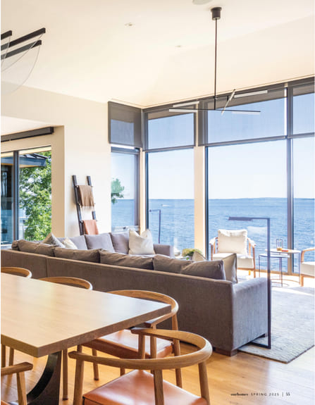 This stunning luxury waterfront home on Georgian Bay features wide plank white oak flooring. Featured in the Spring 2025 issue of Our Homes Magazine.